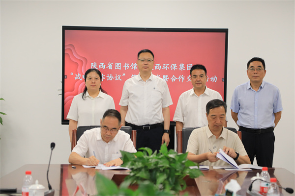 8月14日,陜西環(huán)保集團(tuán)與陜西省圖書館在省圖書館高新館區(qū)簽訂戰(zhàn)略合作協(xié)議。陜西環(huán)保集團(tuán)黨委書記、董事長(zhǎng)郝軍亮,陜西省圖書館黨委書記、館長(zhǎng)周云岳出席簽約儀式。陜西環(huán)保集團(tuán)黨委副書記、董事、工會(huì)主席趙建文,陜西省圖書館黨委委員、工會(huì)主席胡竹林分別代表雙方簽署協(xié)議。