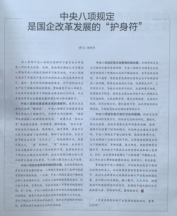 日前出版的《國企》雜志刊發(fā)了陜西環(huán)保集團(tuán)黨委副書記、董事、總經(jīng)理宋世杰同志文章《中央八項(xiàng)規(guī)定是國企改革發(fā)展的“護(hù)身符”》?,F(xiàn)刊載如下,以饗讀者。
